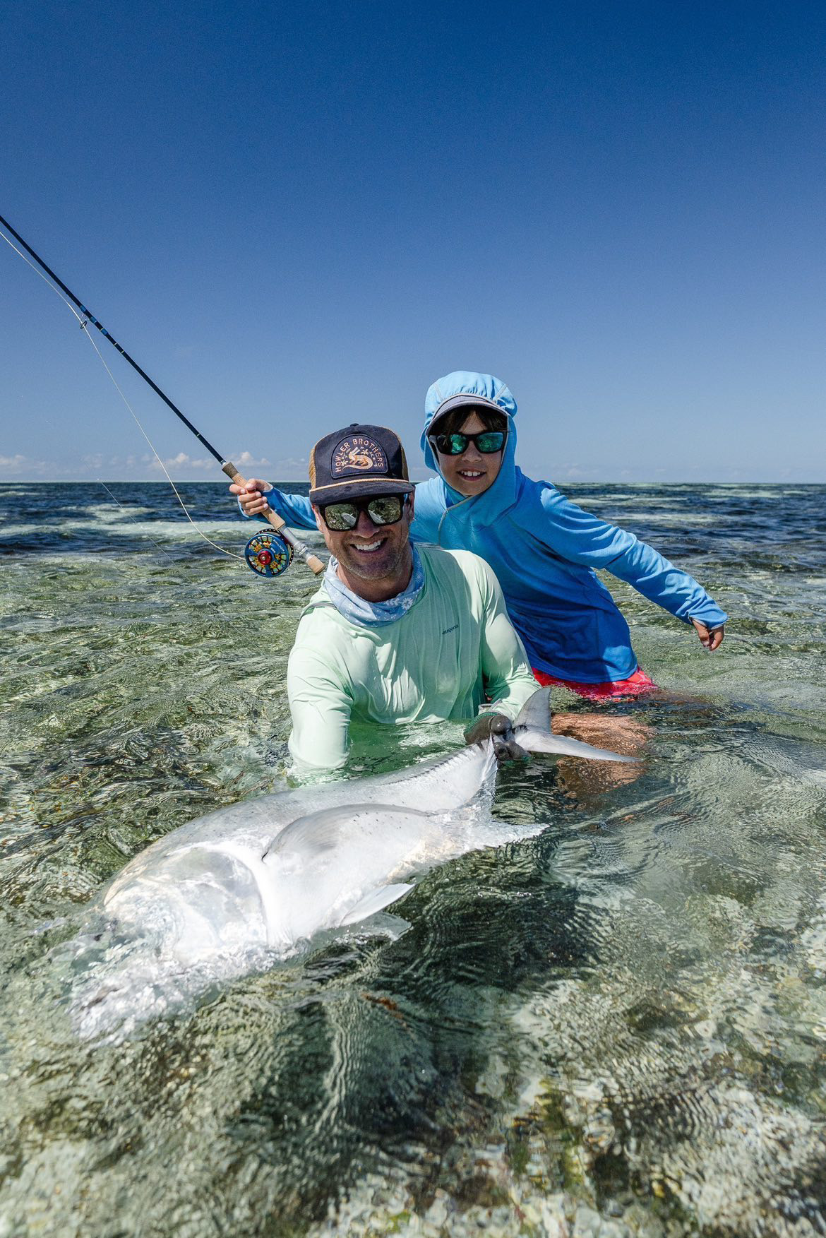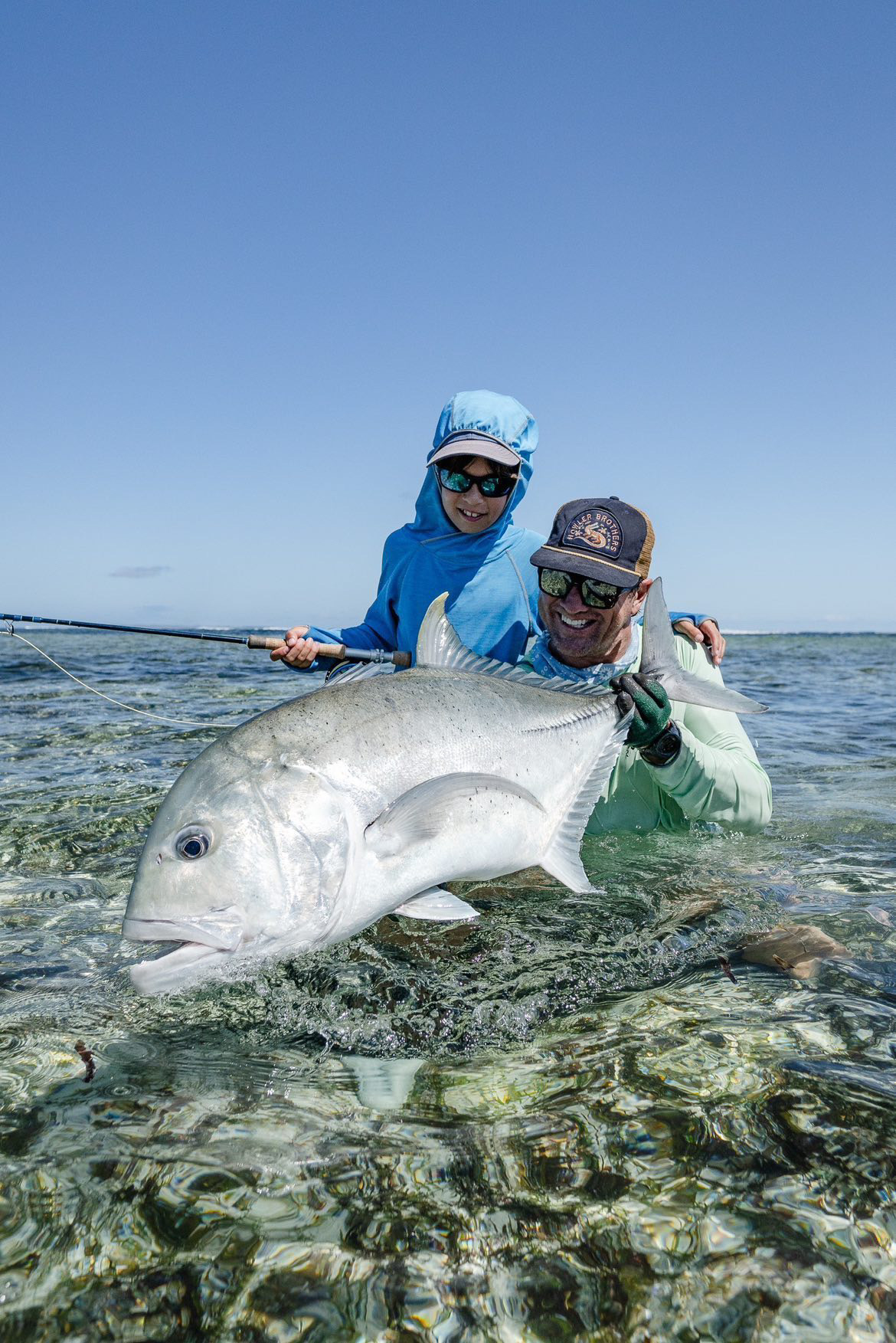 “My sons first GT on fly – As a 12 weight was too heavy for the arms of an 11 year old, we opted for a 9 weight Thomas & Thomas Sextant, 40 pound monofilament and a smaller fly pattern. After hooked it was a case of hold tight as the fish left the flat and headed for the surf zone. Pano has fought piles of fish in the past both hooked by him and I so it wasn’t a new experience. After 25 minutes we had a beautiful 95cm GT in hand. A happy father and a happy angler all be it with a worn out arm.”
