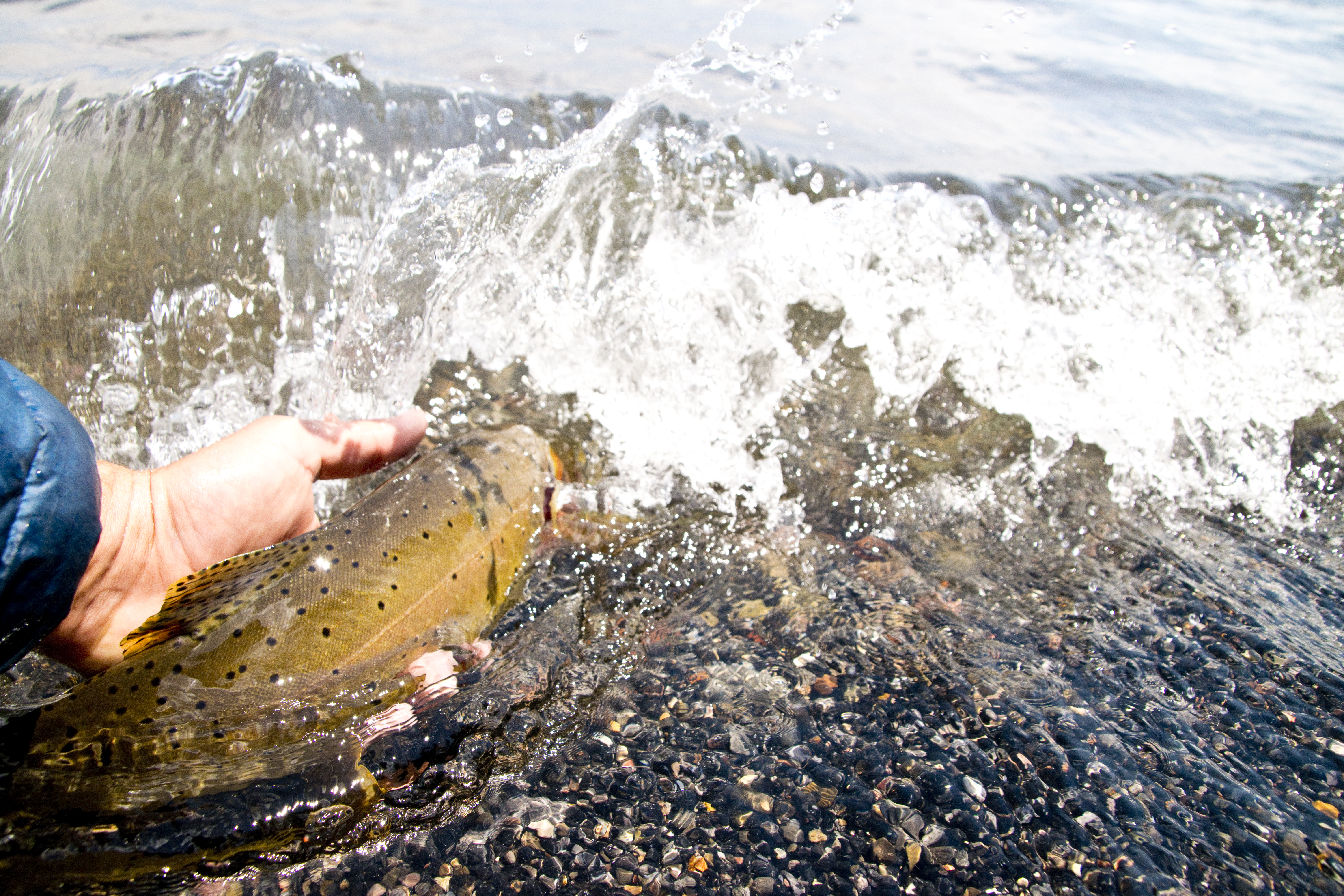 I made it to the western shore of the lake after the West Thumb just in time for the wind to start pushing me north to my car and to the greatest abundance of cutthroat for the entire trip. All clustered near the shore on the sandy pits between vegetation and stone about ten feet deep. I’d be able to get a quick glance of them before they’d dart off to a distant patch of sand disappearing into the abyss. Camouflaging wonderfully, never to be seen again.